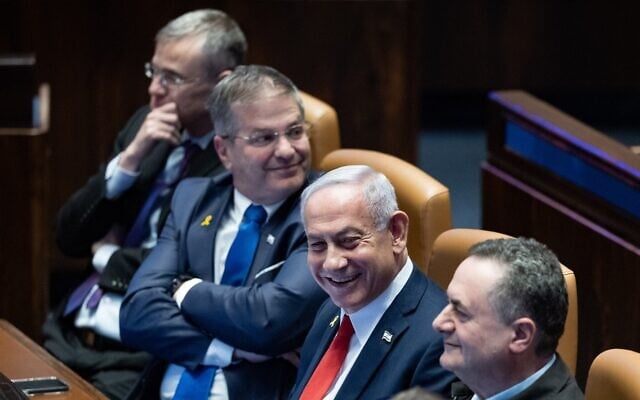 Prime Minister Benjamin Netanyahu sits with ministers Israel Katz (foreground), Yoav Kisch and Yariv Levin (background) in the Knesset, during a debate on calls for a state inquiry into the failures surrounding October 7, 2023’s Hamas invasion and slaughter, on March 3, 2025. (Chaim Goldberg/Flash90)