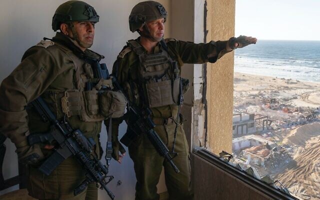 Chief of the Southern Command, Maj. Gen. Yaron Finkelman (right) and Brig. Gen. Itzik Cohen, the commander of the 162nd Division, in northern Gaza, February 1, 2024. (Israel Defense Forces)