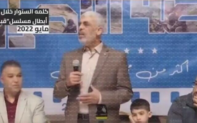 Hamas’s Gaza chief Yahya Sinwar speaks at what Israel’s Channel 12 says was a 2022 ceremony awarding prizes to a Hamas TV drama on a Hamas invasion of Israel. (Channel 12 screenshot, used in accordance with clause 27a of the copyright law)