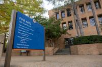 A blue sign in front of a building reads Fine Arts, with various departments listed below.