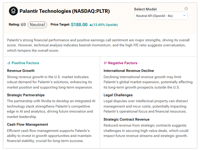 According to TipRanks A.I. Stock Analysis, Palantir stock earns a score of 69 out of 100, reflecting strong financial performance, offset by bearish technical indicators and valuation concerns.