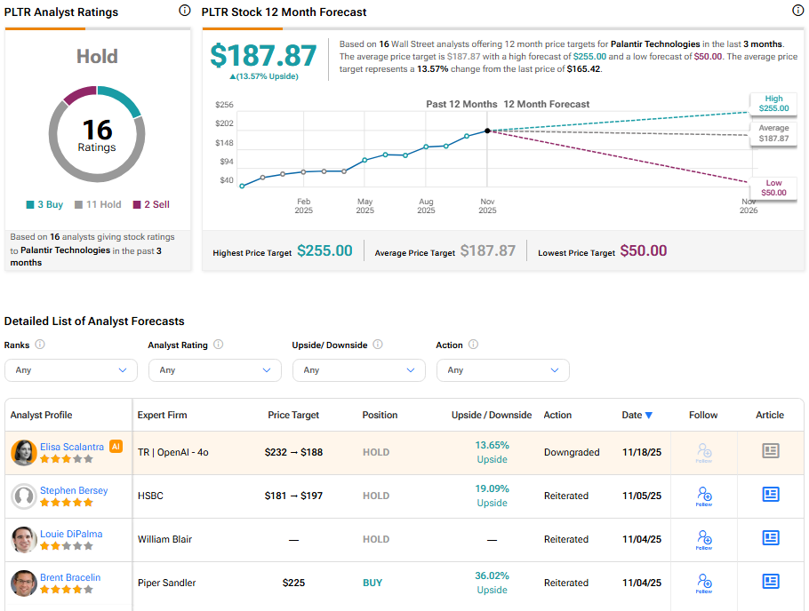 Currently, Wall Street has a Hold consensus rating on Palantir stock based on 11 Holds, three Buys, and two Sell recommendations. The average PLTR stock price target of $187.87 indicates a 13.57% possible upside from current levels.