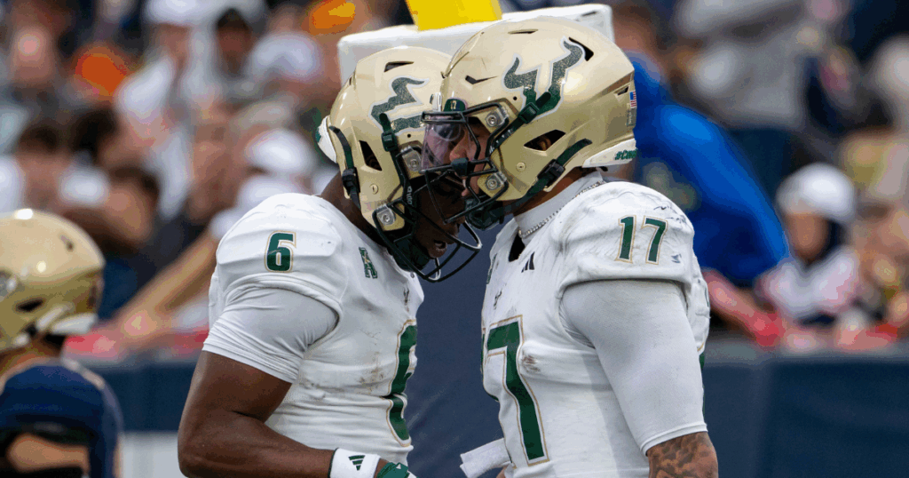Nov 15, 2025; Annapolis, Maryland, USA; South Florida Bulls quarterback Byrum Brown (17) celebrates with wide receiver Mudia Reuben (6) after scoring a touchdown during the second half against the Navy Midshipmen at Navy-Marine Corps Memorial Stadium. Navy Midshipmen defeated South Florida Bulls 41-28. Mandatory Credit: Tommy Gilligan-Imagn Images