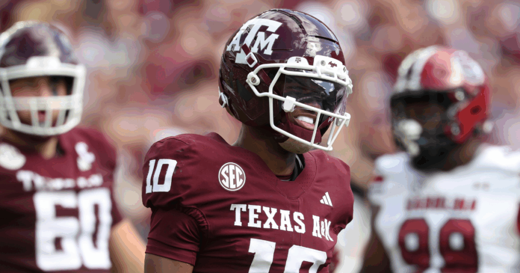 Nov 15, 2025; College Station, Texas, USA; Texas A&M Aggies quarterback Marcel Reed (10) reacdts after a play during the second quarter against the South Carolina Gamecocks at Kyle Field. Mandatory Credit: Troy Taormina-Imagn Images