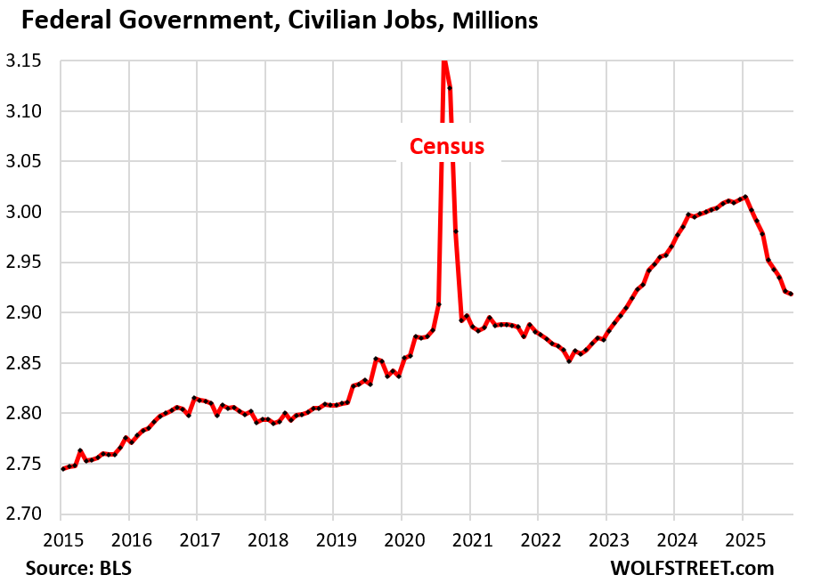 Civilian employment at the federal government dropped by 3,000 in September, to 2.92 million, taking employment back to where it had been in June 2023.