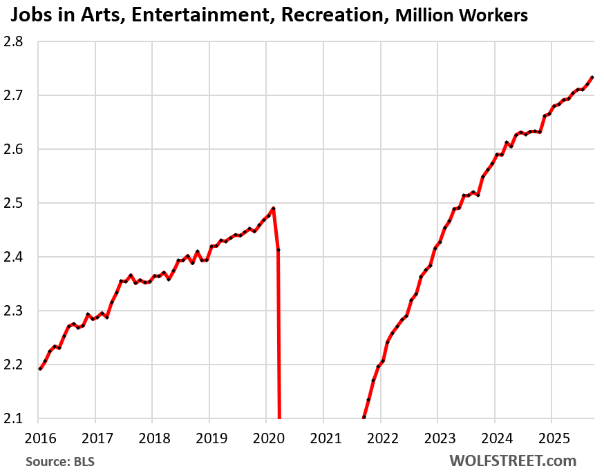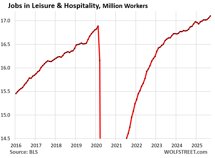 Leisure and hospitality – restaurants, lodging, resorts, etc. After the collapse of employment during the lockdowns, the industry’s employment has fully recovered and has continued to grow: