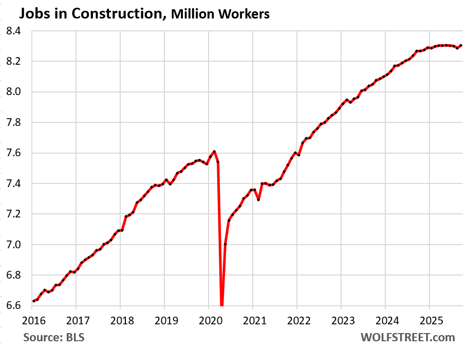 Construction (all types, from single-family housing to highways). Construction in the housing sector and the office has been hit by lack of demand. But construction in other sectors has been stronger, and construction of data centers, factories, and power plants has been booming amid complaints of shortages of skilled labor.