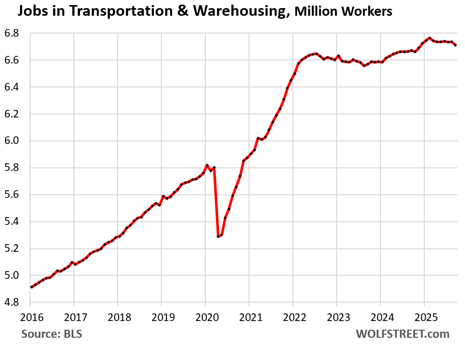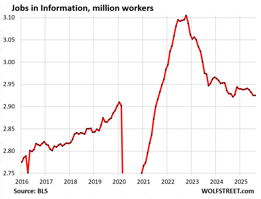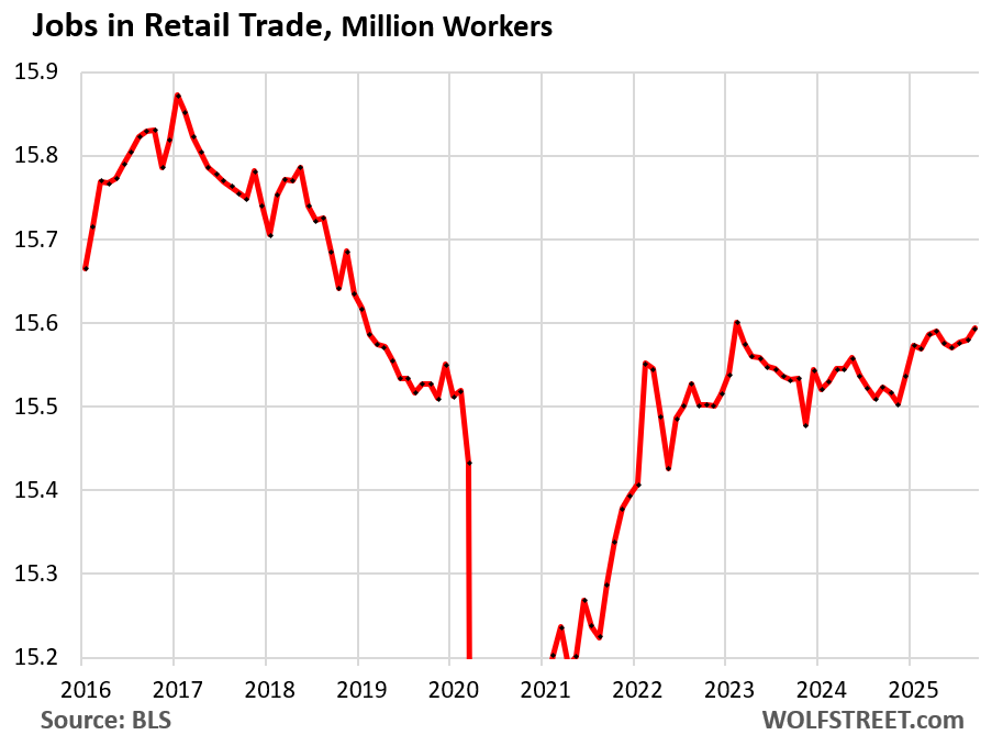 A big portion of this sector has been under pressure from ecommerce, and dozens of major retailers have been liquidated in bankruptcy court, some of which we have documented since 2016 in our Brick-and-Mortar Meltdown series. The long-term decline in employment began in 2017, driven by employment at malls, with malls themselves turning into zombie malls around the country.