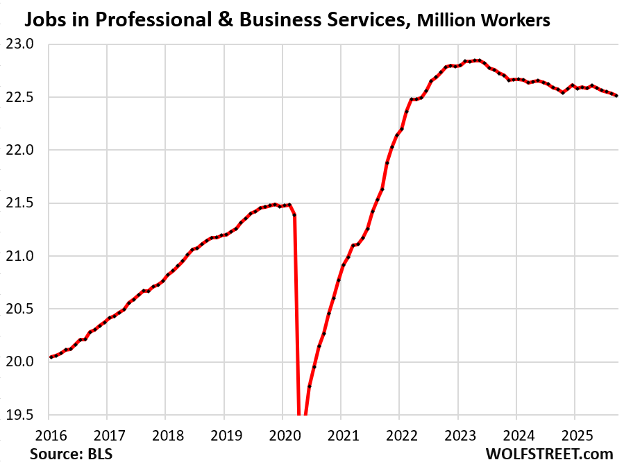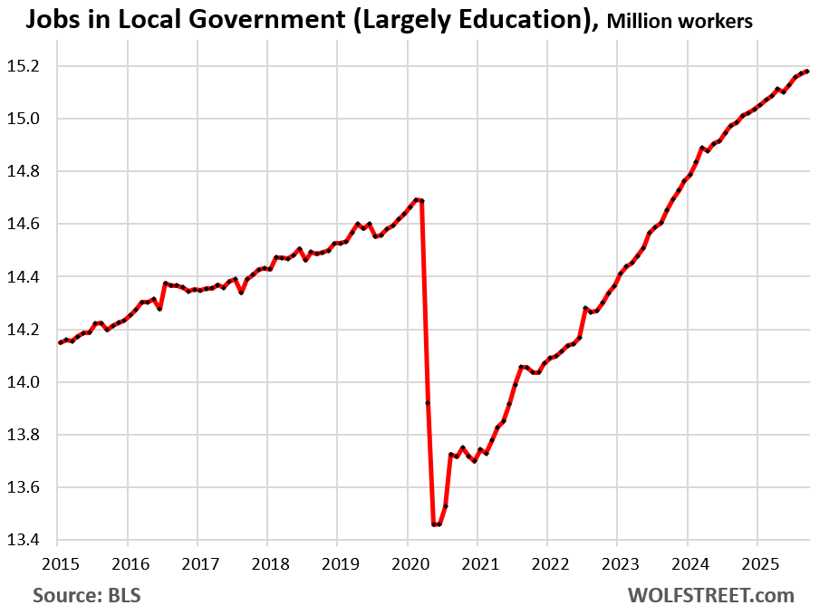Government payrolls don’t include workers at government contractors. They’re in private-sector categories, such as in “Professional and business services,” and we have seen some declines there this year, though it is impossible to determine what portion is due to government cutbacks.