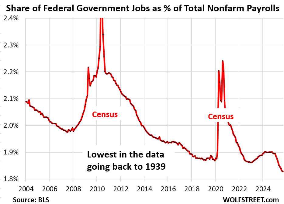 The share of federal employment dropped to 1.82% of total employment, the lowest in the data going back to 1939.