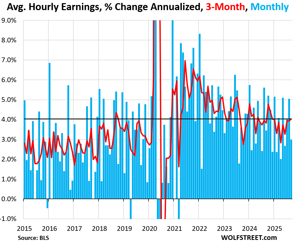 Average hourly earnings rose by 0.25% in September from August (+3.0% annualized. The three-month average hourly earnings rose by 4.0% annualized, a slight acceleration. The three-month average has zigzagged since April.