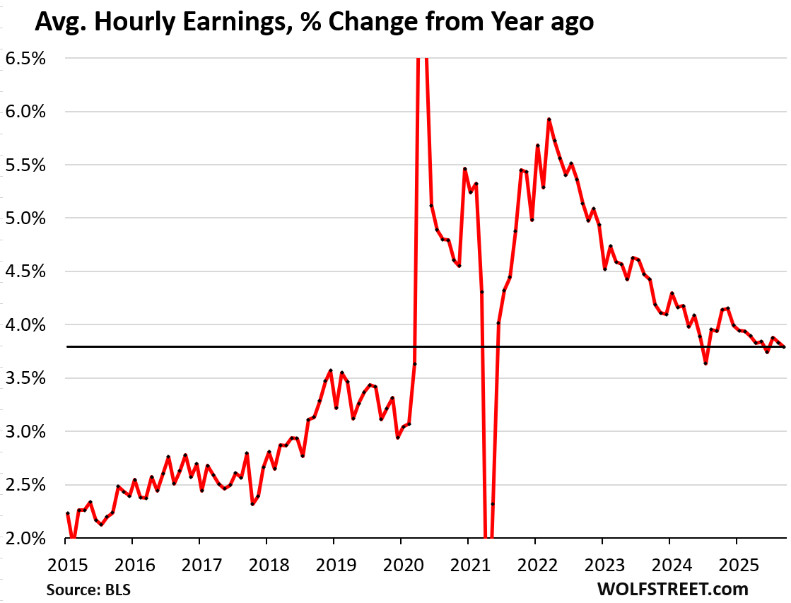 Year-over-year, average hourly earnings rose by 3.8% in September, a slight deceleration from the prior two months, but well above the wage growth before the pandemic.