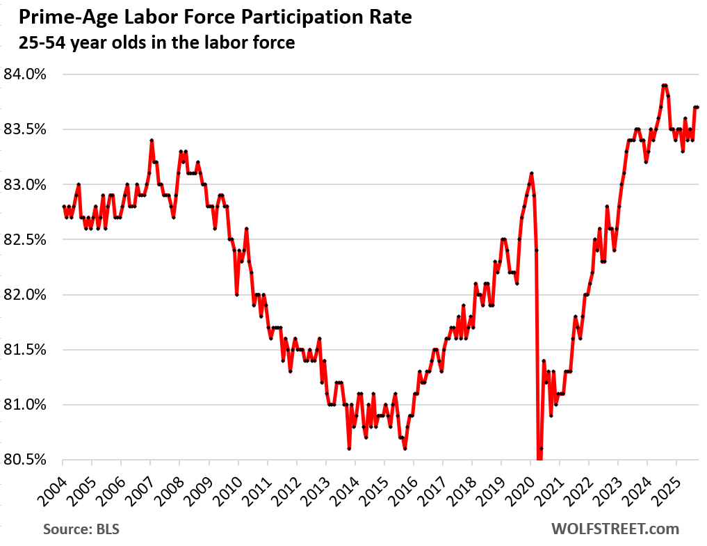 The prime-age labor force participation rate (25-to-54-year-olds) remained at 83.7% in September, same as August, which is historically high.