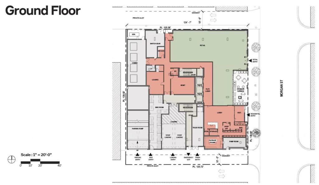 The Chicago Plan Commission has approved the revised plans for the mixed-use development at 214 North Morgan Street in Fulton Market. Sitting mid-block between Lake and Fulton Streets, the site was originally set to hold a taller, multi-tiered tower under a different developer. However, those plans never came to fruition, and a new team has taken over with the current proposal.