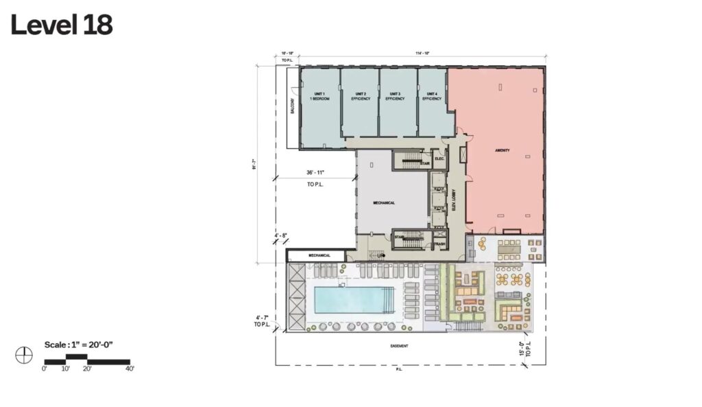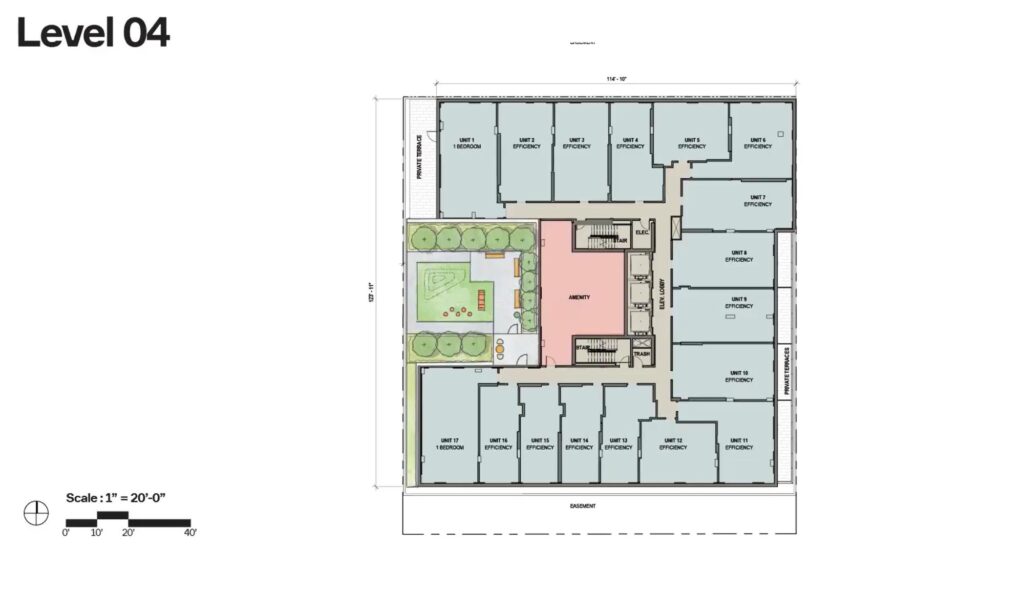 The ramp will lead to a 30-space parking garage spanning the next two floors. This will be capped by a small amenity space and dog park, surrounded by the U-shaped residential tower above. In total, there will be 268 residential units, consisting of 239 studios and 29 one-bedroom layouts. Of those, 54 will be considered affordable.