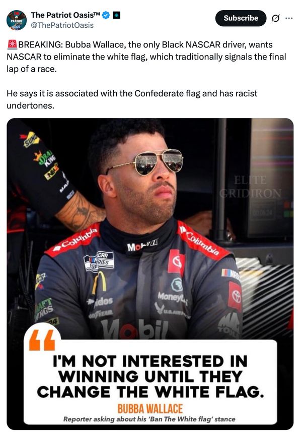 A rumor that Bubba Wallace, the only Black driver in NASCAR’s top series, wants the organization to eliminate the white flag because of its apparent association with the Confederate flag circulated online in June 2025.