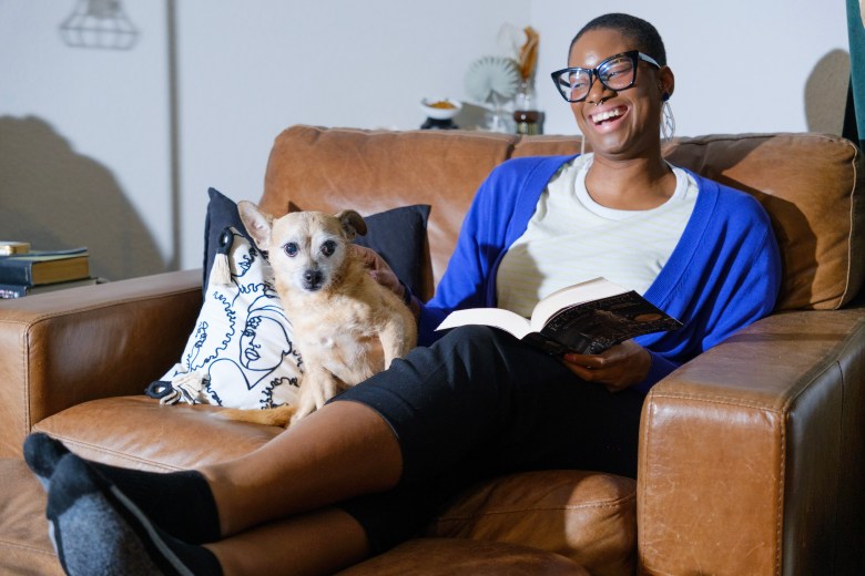 Kimani Mitchell curls up with her dog Spencer and a good book in her Cinco Lakes home. Credit: Clint Datchuk for the San Antonio Report
