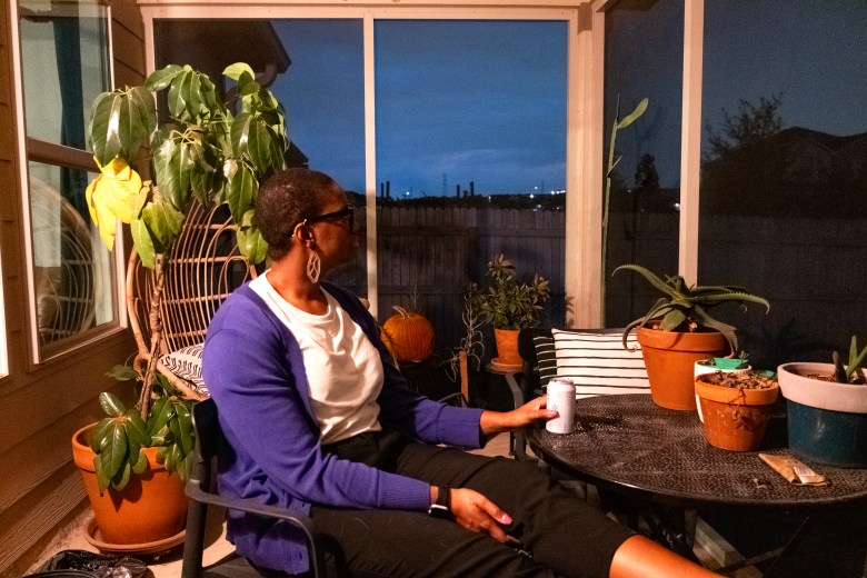Kimani enjoys relaxing on her back patio, where she can enjoy the serenity of evenings in the Cinco Lakes community. Credit: Clint Datchuk for the San Antonio Report