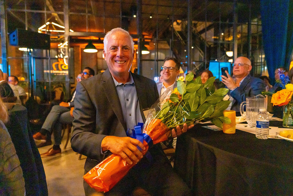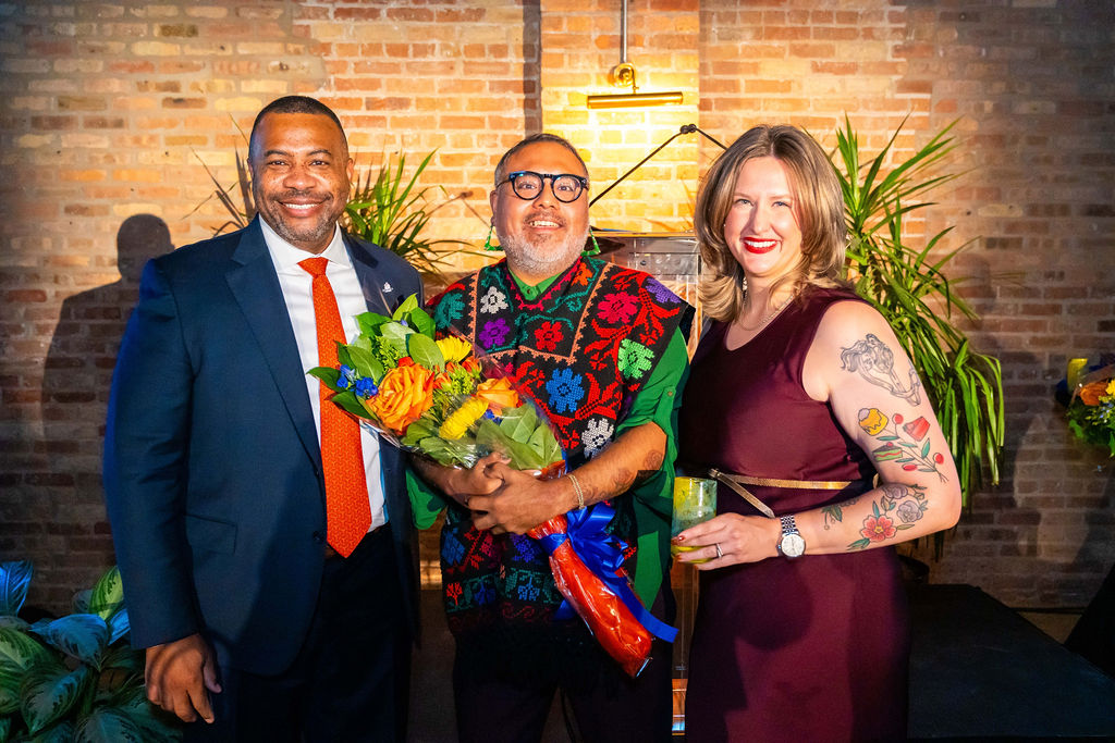 2025 Awards Selection Committee Chair Nick Bruce (left), honoree Tony Alvarado Rivera (center), and Bright Promises Executive Director Katherine Korey (right)