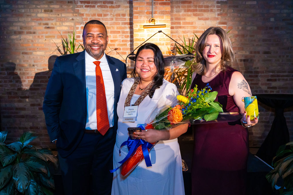 2025 Awards Selection Committee Chair Nick Bruce (left), honoree Maria Paula Gareza Degillo (center), and Bright Promises Executive Director Katherine Korey (right)