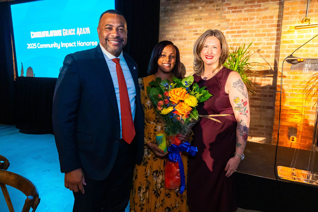 2025 Awards Selection Committee Chair Nick Bruce (left), honoree Grace Araya (center), and Bright Promises Executive Director Katherine Korey (right)