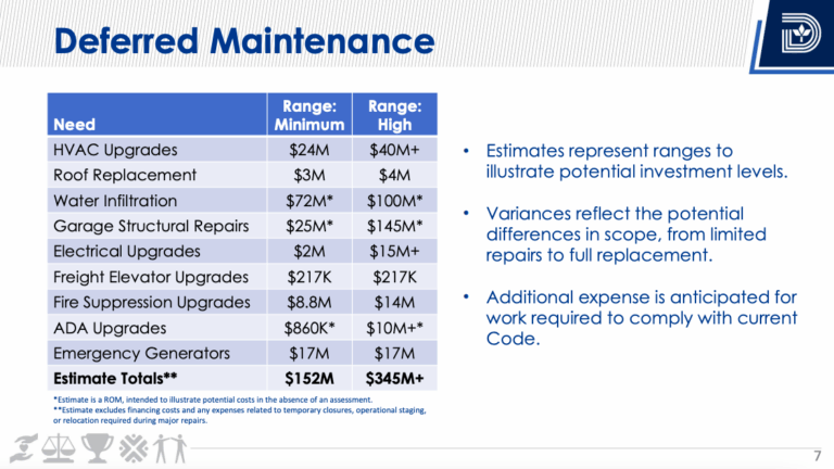 The report had some important caveats that suggest staff may be on to something. AECOM stressed that its repair figures were rough estimates that could vary by as much as 50%. They also noted they exclude design fees, code-required upgrades, hazardous materials abatement, and any analysis of leaks or structural integrity. And, of course, there’s inflation.