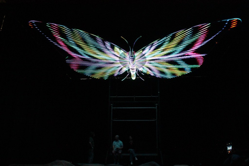 One exhibit within the sprawling exhibition is an interactive sculpture that invites guests to help a 26-foot butterfly “fly.” Christopher Schardt’s “Mariposa,” which features a butterfly overhead that has nearly 40,000 LED lights synchronized to music and movement, was first introduced at Burning Man 2023. Both the lights and the wings spring to life once visitors sit on a bench below the insect sculpture and begin to swing. Surrounded by floor cushions and bean bags, the exhibit offers ample space for both participation and observation.