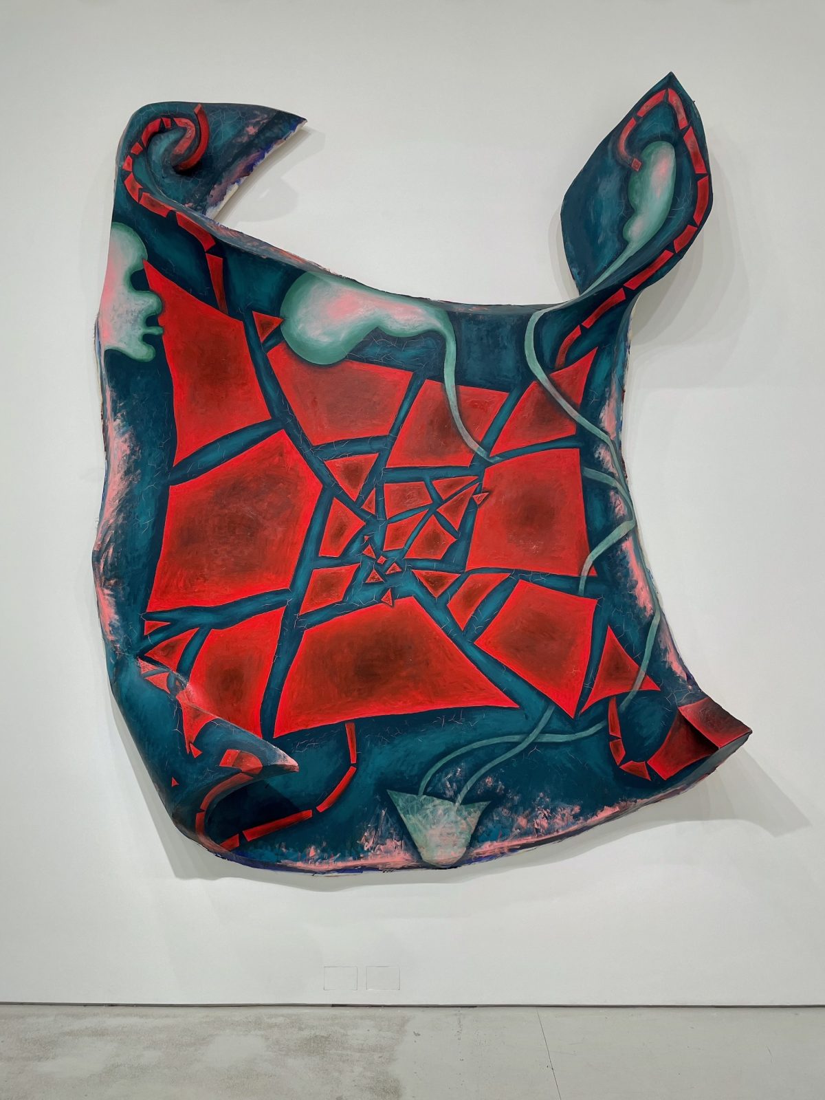 Murray’s paintings, “Flying Bye” (1982) and “Making It Up” (1986), are populated by cartoony abstract forms. The latter has been stretched around an almost square rectangle that curls along the edges as well as folds over like a blanket. A graphic red rectangle breaking apart has been painted on the dark greenish-blue surface. Emerging from the cracked red rectangle are tubular forms ending in blobby pale blue clouds tinged with pink. There are also four segmented red tails coming in from the corners, one of which ends in a triangle. The tension between the clarity of the forms and what they signify holds our attention; we cannot quite decipher what is going on. Works like these signaled a hinge point in her work; in the ’70s, she began moving away from subjects such as coffee cups and tables to make abstract paintings more elusive to interpretation.