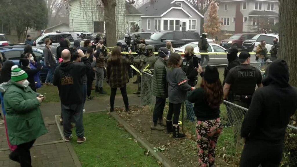 A large group of local and federal law enforcement officials was spotted at a home in St. Paul on Tuesday morning, drawing a similarly big group of protesters.