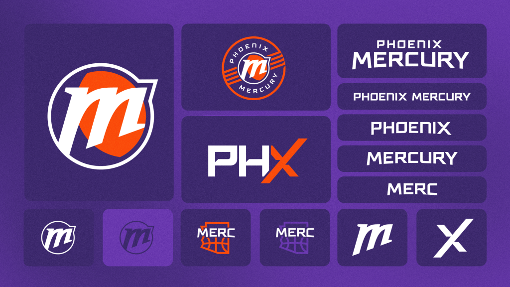 A look at the Phoenix Mercury’s full rebrand toolkit, featuring the updated primary and global logos, revised wordmarks, the refreshed PHX alternate mark and the franchise’s first-ever secondary logo incorporating the “Merc” moniker and an outline of Arizona. (Photo courtesy of Phoenix Mercury)