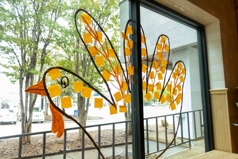 Post-it notes with messages of what people are thankful for sit on a window in Arlington’s Taste Community Restaurant Nov. 24. (Chris Moss | Arlington Report)