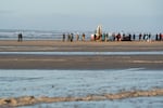 People gather around a beached whale at San Marine State Park.