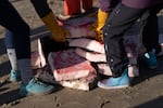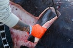 From left, Kaylee Myers, Justyne Oleman and Nova Ware of the Siletz Tribe search for bones in the flesh of the whale. Members of the Confederated Tribes of Siletz Indians helped disassemble the whale and collected samples for cultural use.