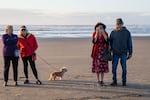 Veterinary students from Oregon State University and professionals from the Oregon Veterinary Diagnostic Laboratory at OSU perform a necropsy on a beached whale near Yachats, Ore., on Nov. 18, 2025. Left to right: Kaitlyn Oliver, Makenna Bailey, Cruzado Diaz, Caitlin Gaffney and Dr. Rachel Fost.