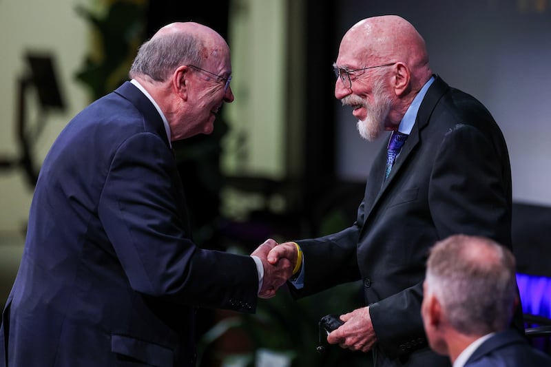 Elder Quentin L. Cook, left, of the Quorum of the Twelve Apostles of The Church of Jesus Christ of Latter-day Saints, greets Kip Thorne, who won the Nobel Prize in physics in 2017, before he spoke Thursday, Nov. 20, 2025, at BYU. | Rio Giancarlo, Deseret News