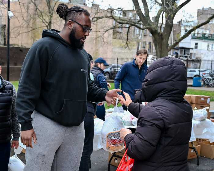 Besides volunteers from Tredway and City Harvest, New York Giants offensive lineman Joshua Ezeudu, who wears No. 75, helped distribute the Thanksgiving staples.