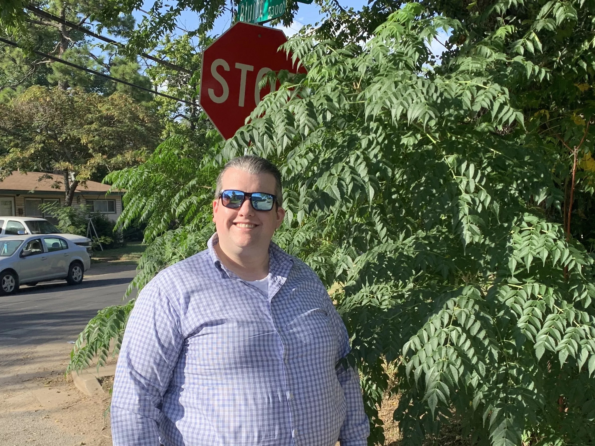 Adam Sharkey, 33, submitted a service request for this stop sign near the Bonton neighborhood because it is obscured by a shrub.