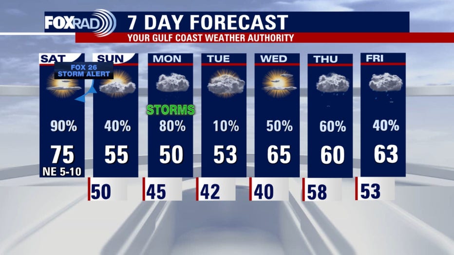 A FOX 26 Storm Alert has been issued for Saturday afternoon through early Sunday morning. Expect scattered strong storms Saturday afternoon and evening with a line of possible strong to severe storms overnight Saturday into Sunday morning.