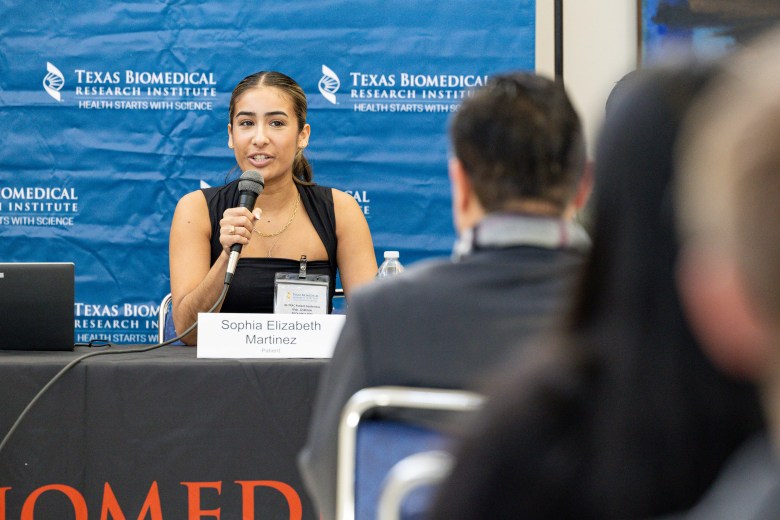 Sophia Elizabeth Martinez speaks about her time battling the respiratory infection and life after tuberculosis during a panel at the Texas Biomedical Research Institute on Oct. 30, 2025. Credit: Amber Esparza / San Antonio Report