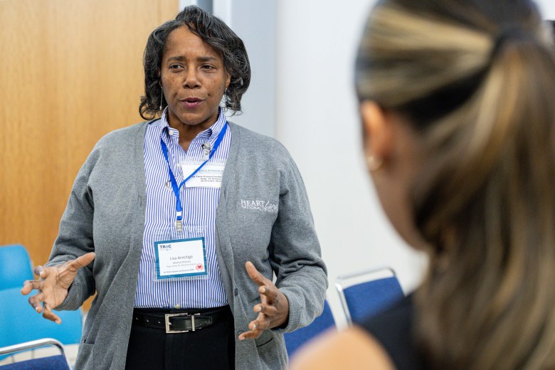 Dr. Lisa Armitige, co-medical director of the Heartland National TB Center, a state-funded tuberculosis clinic, speaks with former TB patients after a panel at the Texas Medical Research Institute on Oct. 30, 2025. Credit: Amber Esparza / San Antonio Report