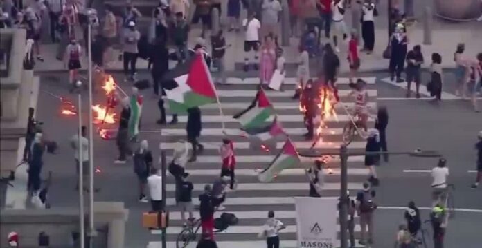 PHILADELPHIA (VINnews) — Masked pro-Palestinian demonstrators burned dozens of American flags outside Philadelphia City Hall, piling the flags on the pavement and setting them ablaze while waving Palestinian flags overhead and chanting.