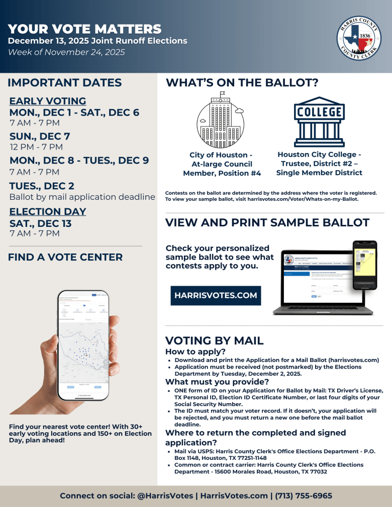 Last month’s election featured 17 constitutional amendments and a hotly contested race between former Houston City Council member Amanda Edwards and Harris County Attorney Christian Menefee. The only items on the December 13 ballot are the Houston City Council runoff and another runoff election for Houston City College trustee.