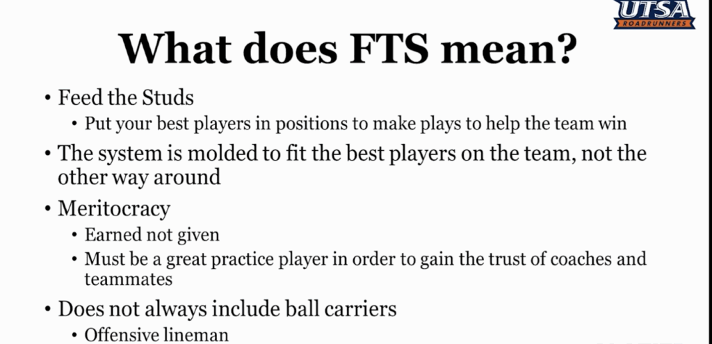 “Get your best players the ball as many times as possible. We say “Feed the Studs”. That’s our way to say it. It’s not rocket science,” Stein said at a coaching convention a few years ago. “Coach said it earlier — plays are highly overrated. I’m gonna talk spacing, they’re great plays, but they’re overrated. If we got trash players they don’t look as good. We have really good players at UTSA. So get your players the ball as many times as you can.”