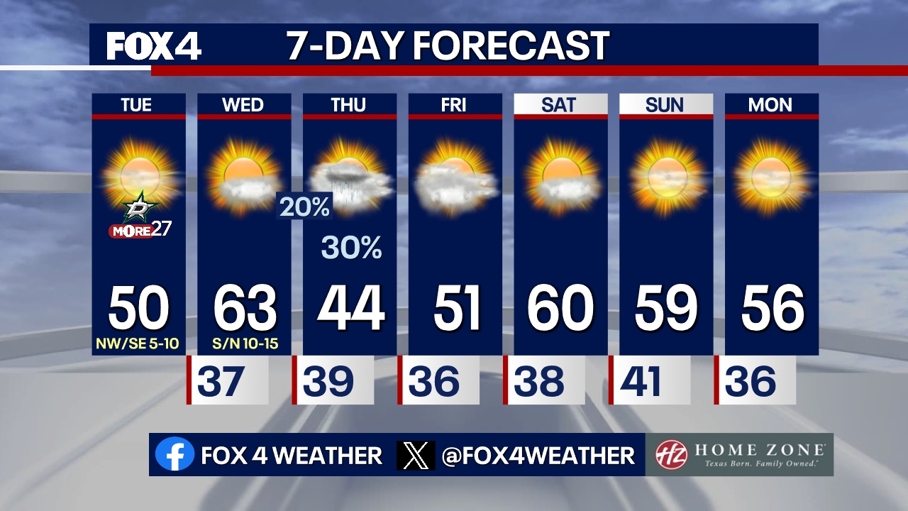 DALLAS – North Texas will experience a roller-coaster temperature ride this week, beginning with a significant freeze Tuesday morning. The DFW area will see a brief warm-up midweek before a strong cold front arrives, bringing scattered rain and cooler temperatures from Wednesday through Friday.