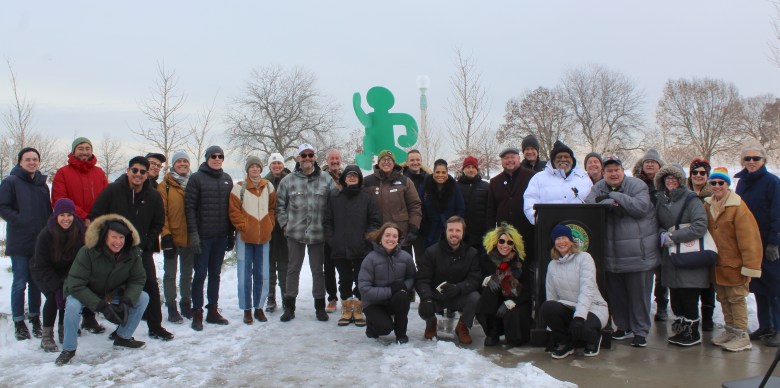 Community members gather in front of the Keith Haring sculpture at the AIDS Garden Chicago on World AIDS Day, Dec. 1, 2025. Photo by Jake Wittich
