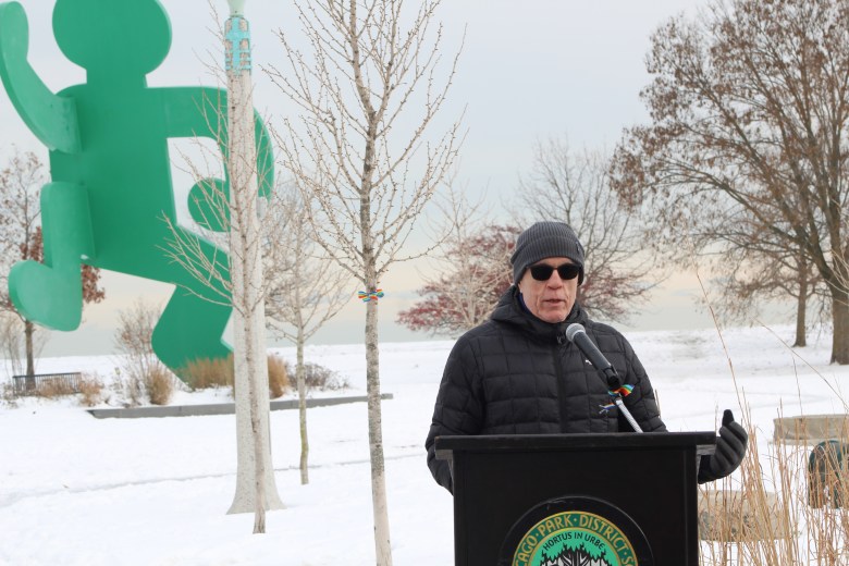 Former State Rep. Greg Harris speaks on World AIDS Day, Dec. 1, 2025, at the AIDS Garden Chicago. Photo by Jake Wittich