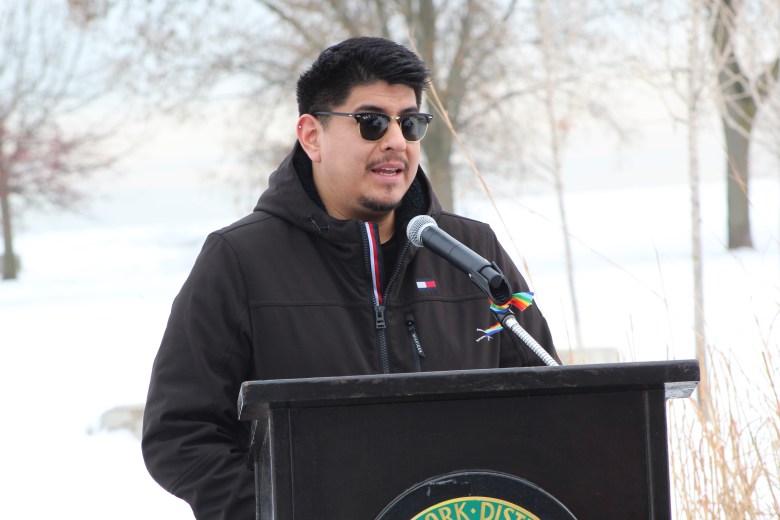 Omar Martínez González of AIDS Foundation Chicago speaks on World AIDS Day, Dec. 1, 2025, at the AIDS Garden Chicago. Photo by Jake Wittich