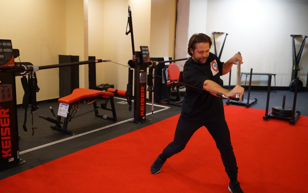 Tom Schneider opened his gym, Coach Tom, at 2000 N. Milwaukee Ave. Logan Square in October and shows off an arm exercise on Nov. 20, 2025. Credit: Ariel Parrella-Aureli/Block Club Chicago