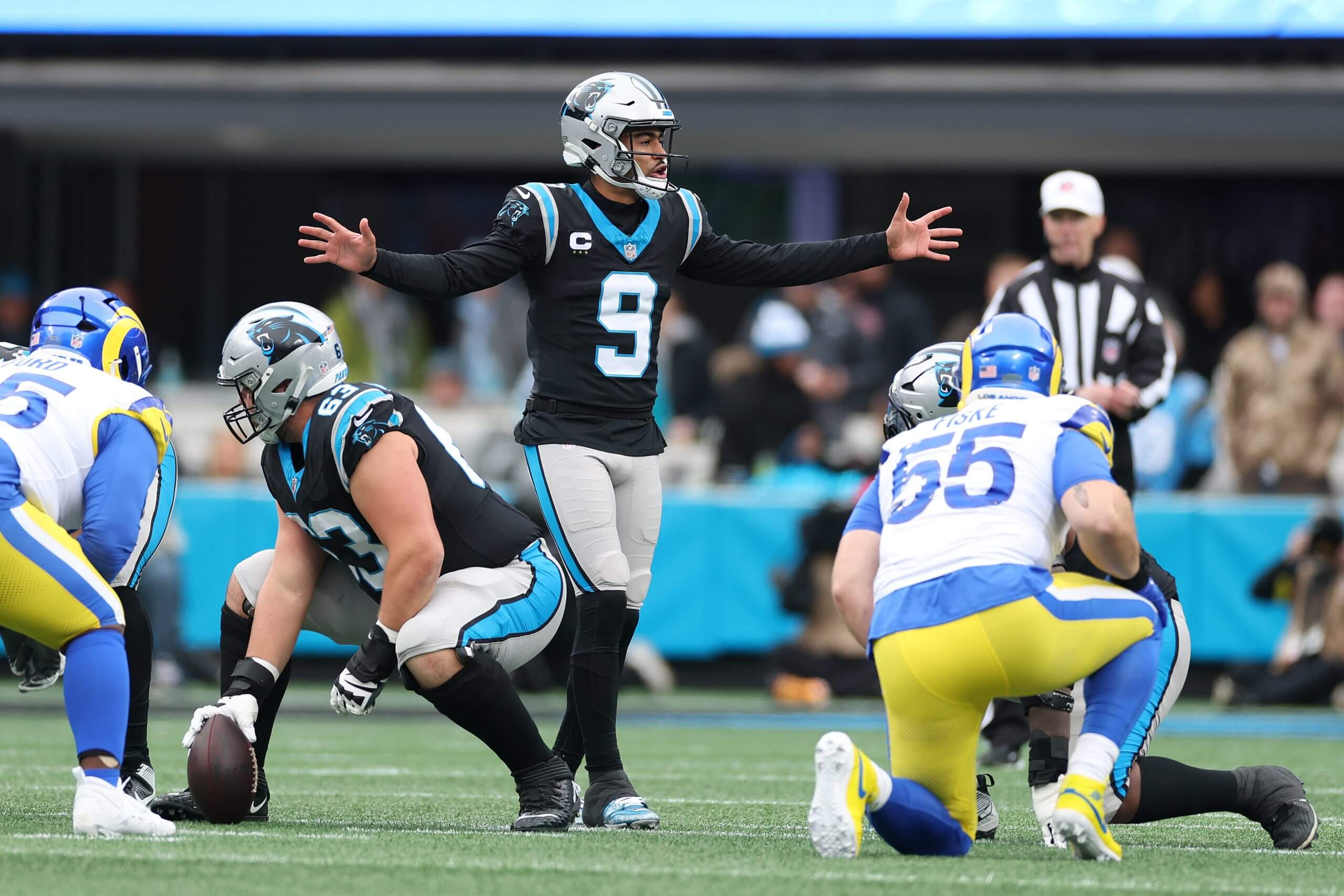 Panthers quarterback Bryce Young has had an up-and-down season, but he had another big day in Sunday’s shocking win over the Rams. (Grant Halverson / Getty Images)