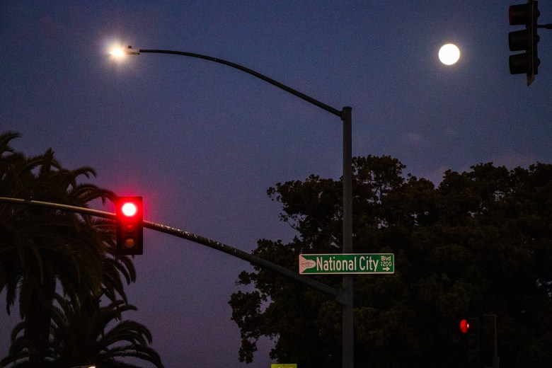 Street lights on a main street in National City on Nov. 4, 2025. (Crystal Niebla/inewsource)